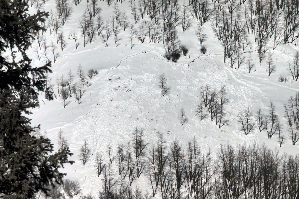 No new snow in the past few days, but we caught this skier caused slide on the south side of the EV Golf Course trees the other day. Hard to tell from the distance, but it appears shallow and wide. We skied a similar, lower in elevation line, on the same face the other day and the snow seemed stable. As we pointed out the other day, sunshine and warm weather doesn’t mean it isn’t still dangerous out there.
