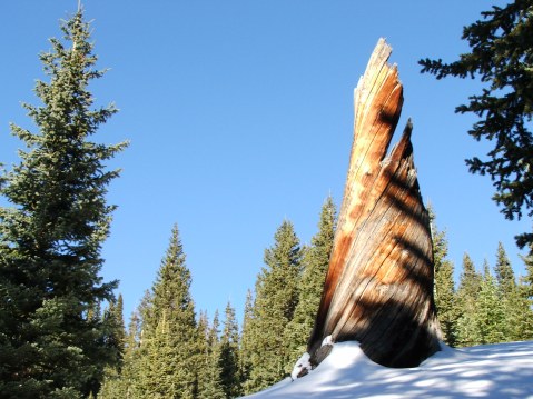 Starting out at the Vail Pass Winter Rec Area, sets of perfect powder turns were already visible up on the SW facing aspect of the drainage just South of the Uneva bowl. A well established skin track already set on Corral Creek Trail made it very nice not to have to break trail, but here and there to keep in tune with “Avi-Thinking”, it’s really important to me to get out of the grooves and break some trail of my own, to gather info and tune into the signals and Red-Flag warnings the ascending trek and snow pack can scream or whisper at me… i.e; whoomphing, collapsing, cracking and sinking up to the top boot buckles. Not to mention poking into the snow pack to gather data on depth and what kinds of hazards are lurking under the deceiving white surface of snow. There are still some buried roots/downed logs, “Shark Fins” (buried rocks) just waiting for an unsuspecting rider to viciously end their season early… Right now the data is a mixed bag of sun drenched areas with zero snow up to two and a half foot deep drifts and everything in between, so be very careful on the way down!