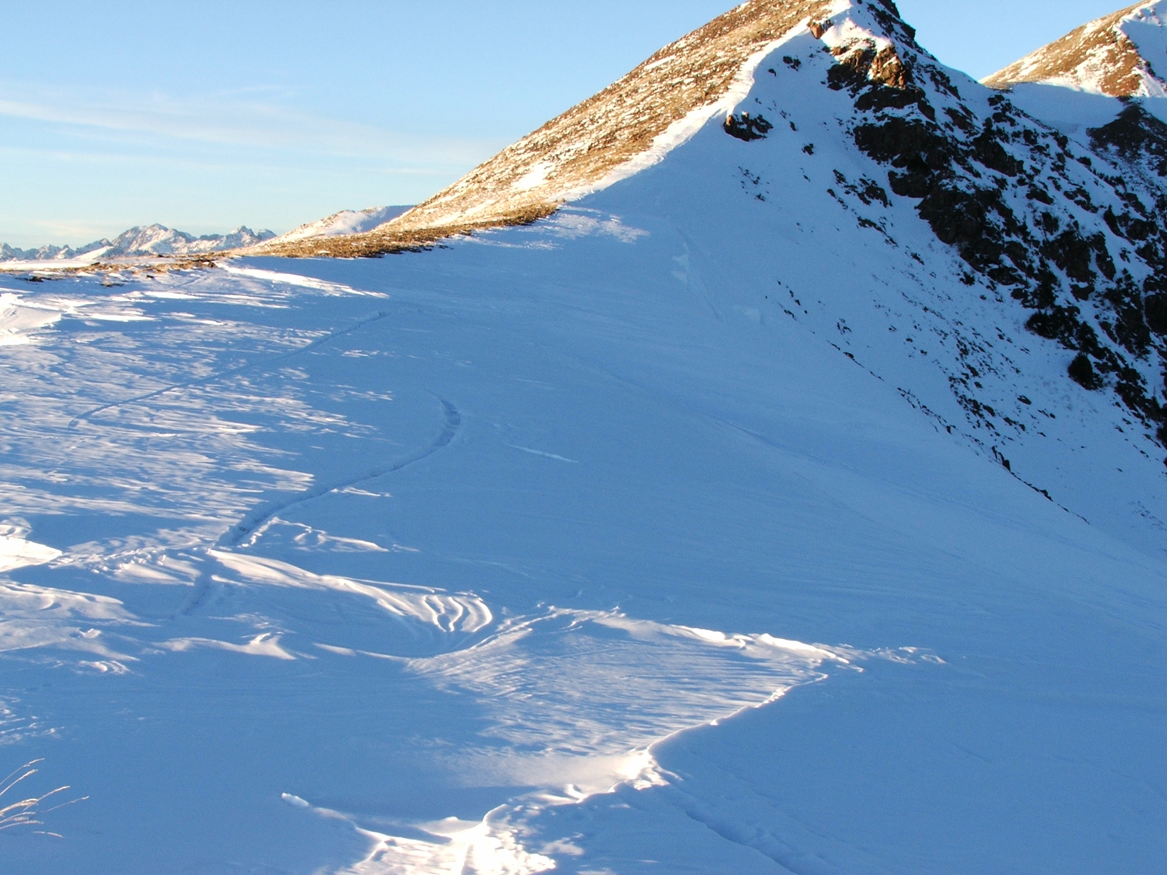 Shot up lookers left ridge, blowing through big wind rolls and baking soda deposition in between. Cleared the trees and was in the midst of a cross-loaded moonscape of Sastrugi and wind scraped rocks. Made it to the most accessible drop-in point at the lookers right side of the “Baldness” and sat to enjoy the solitude, scenery and the distance between myself and the rest of the world’s insanity. It’s enlightening that one can find moments of true inner peace surrounded by “hell-fire”. Goes to show one can still enjoy the backcountry on “High” Danger days, all it takes is the right route planning, slope and aspect and ice cream dreams can become a reality.