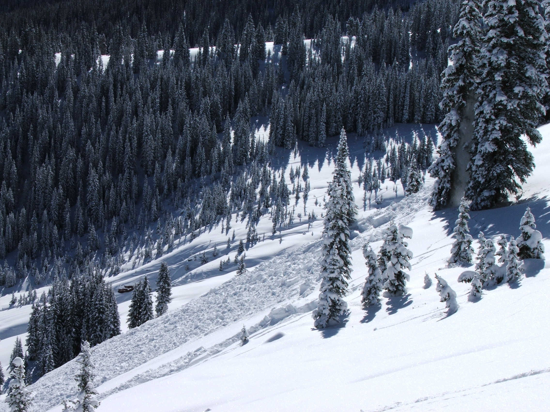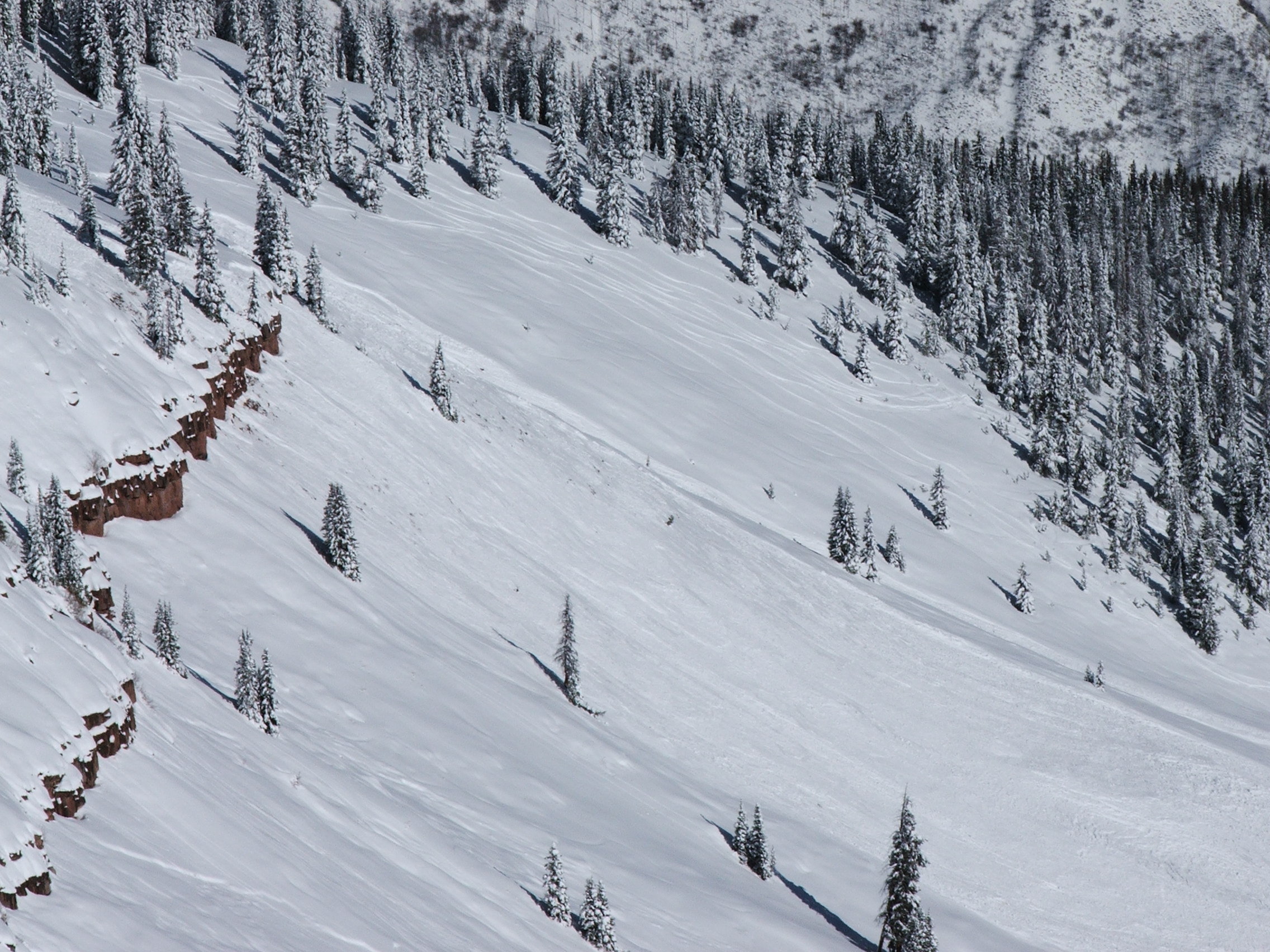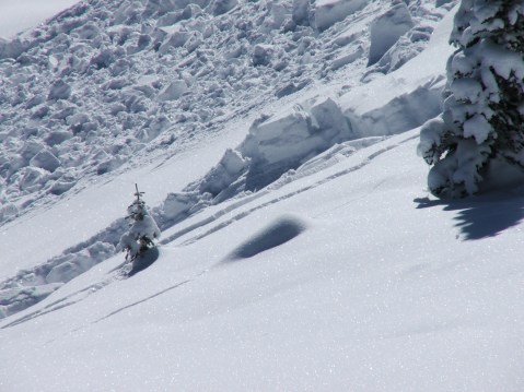 Evidence of two slides can be seen here, one during the last storm the other since yesterday. Also noted, were shooting cracks and obvious instability in the open glades. Further down to our riders right was a much more significant avi event that ran much farther.