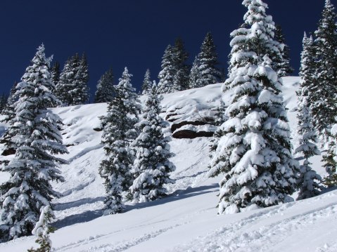 Storms like this past Saturday’s is a little more what we could use three times a week for the rest of the month, but let’s face it, what’s here is now… and now we have a pretty weak snow pack. Studying the avy roses of the CAIC, the weakest areas should lie on the east facing slopes in the Vail-Summit Zone. I decided that’s exactly where I would belay to a shaded 38 degree slope on the NE side of the tall pines that separate East Abe’s and the open east facing slopes of Benchmark. Reason being, this is most likely where persistant weaknesses will remain throughout this season’s snow pack.