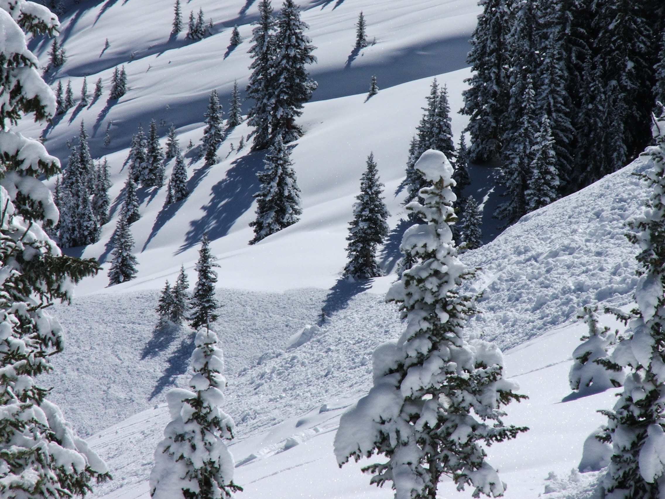 Did not approach slides due to the presence of hangfire and obvious signs of instability. Stuck to lower angle pitches and skied amongst tall pines that were possible anchors for the weak snowpack. Below treeline, more cracking below the traverse through the aspens was observed.