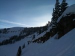 Tuesday I made the most of the sunny afternoon to shoot up to the top of Benchmark, poke around and see what’s going on back in EV. Skinning out from Two Elk’s, it’s pretty obvious we are no where near the much needed snow pack to get things rolling in the back bowls. I love the sunshine, but seeing a brown-out on all the south facers that were caked deep only twelve months prior is a bit of a downer. Guess the snow is only hanging in the shade and baking in the sun. The slopes are littered with surface hoar, caused by the clear night’s frost and the sunshine baking bonds into weak facets.