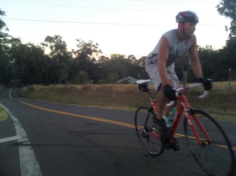 Five thirty in the morning and I’m headed in the darkness to the small town of Paia on Maui’s west side, across from the legendary windsurfing mecca of Ho’okipa beach. The Fuji road bike is assembled and ready for the ride that starts here, climbs up country through the ranch towns of Makowao and Kula and into Haaleakela park. I plug in the headphones and I’m off, go team!