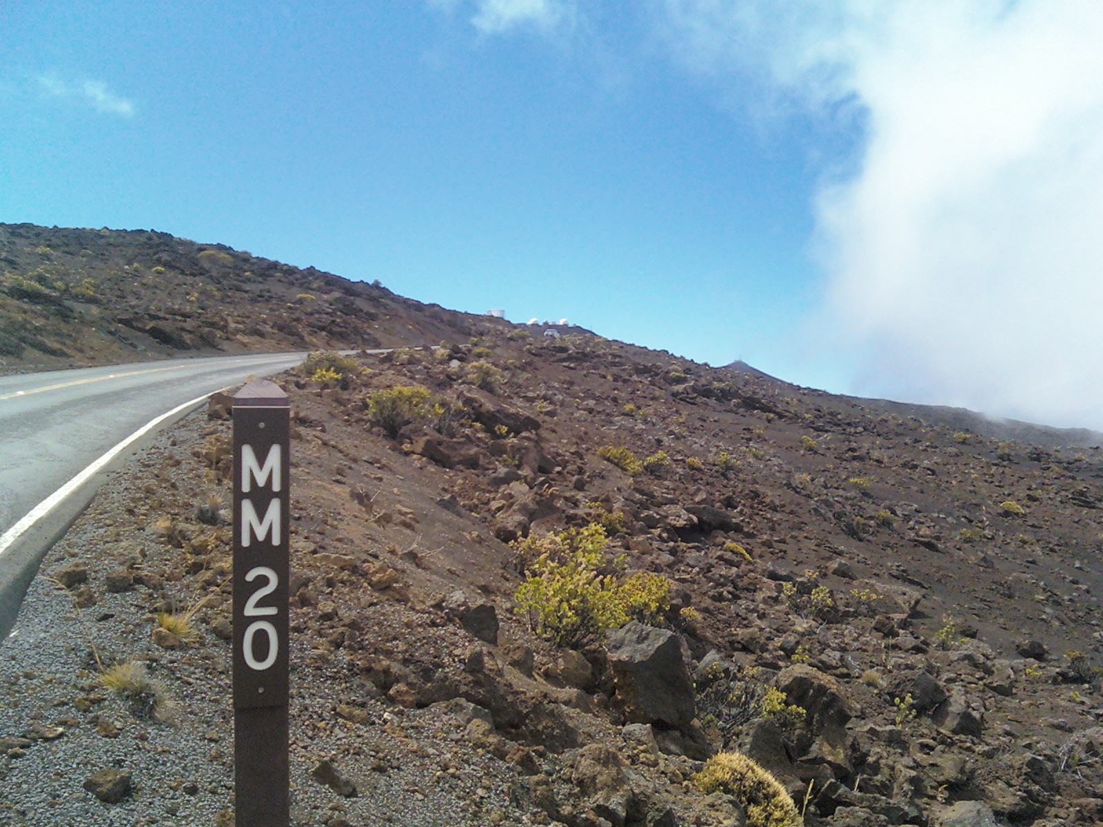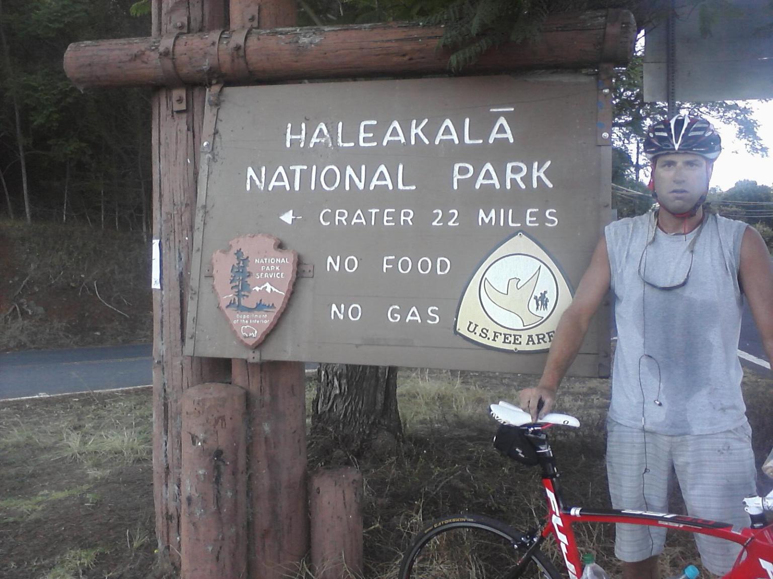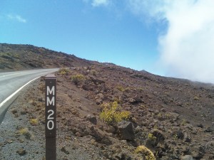 An hour has taken me through the two towns and I stand at the Haleaakela park sign, my first break. The approach is done and now the true climb begins. I try not to think about the twenty two miles left. I still feel strong but the first fifteen miles has me sweating and legs feeling it. Time for the mental games to begin, trying to take chunks out of the miles by aiming for smaller goals, the next sign, the next switch back. Fueling and drinking as much as i can, I begin the endless parade of switchbacks up the flanks of the volcano. There are markers on the pavement for bikers like myself, indicating the elevation and giving instructions when to eat and drink. Ryan putters by me and waits every half mile to give me a towel as I am drenched in sweat 2500′ feet and climbing…
