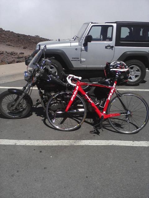 I recover amazingly fast. The bannanas help and my body seems to adjust to the altitude pretty quickly. Compared to how bad I felt just a little while ago it is night and day. I break no land speed records for the last half mile to the actual summit but I make it. The clouds break and we get great views of the Big Island’s 13000′ foot volcano. Ryan and I get the obligitory photos up top and turn around for the descent. All downhill now. It is done. Kind of like hitting mushroom rock in EV. Glad I did it, more glad I never have to do it again, but what a challenge. I push off for the downhill and the miles clip past, somewhere in the middle of the descent I start laughing like Stewie from Family Guy and name my bike Silky for its superoirty on the downhill(I’m still a tad loopy) Only one scary moment coming down. I hit a hairpin too fast, laid on the breaks and Tokyo drifted towards the opposite gaurdrail. I stop, reassess and proceed with a little extra caution toward the beaches and towns where I belong. I give myself a passing grade, maybe not an A but sometimes passing is enough…Aloha