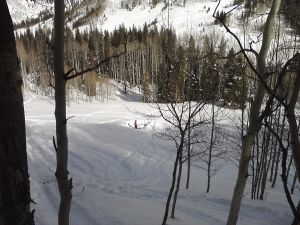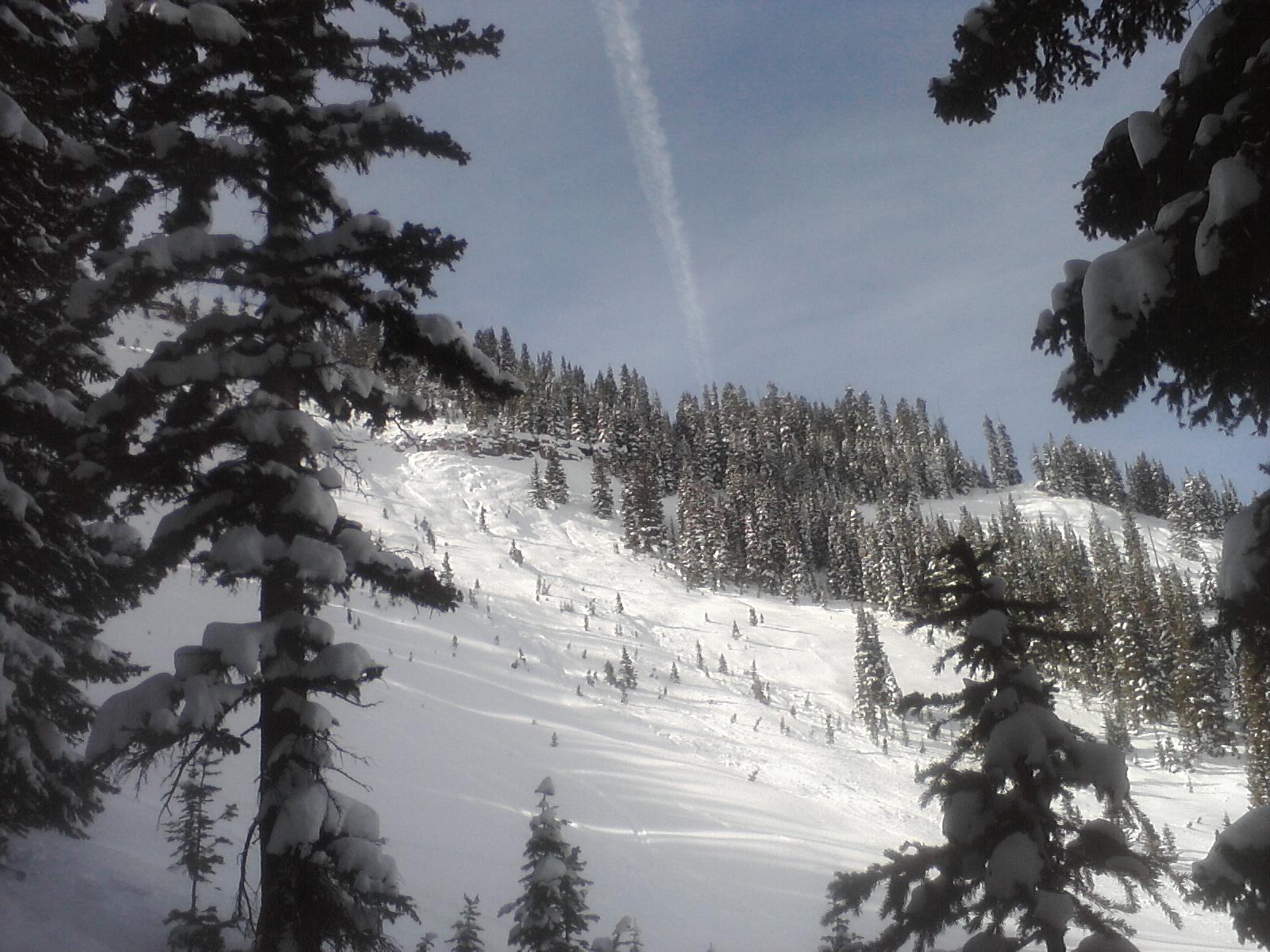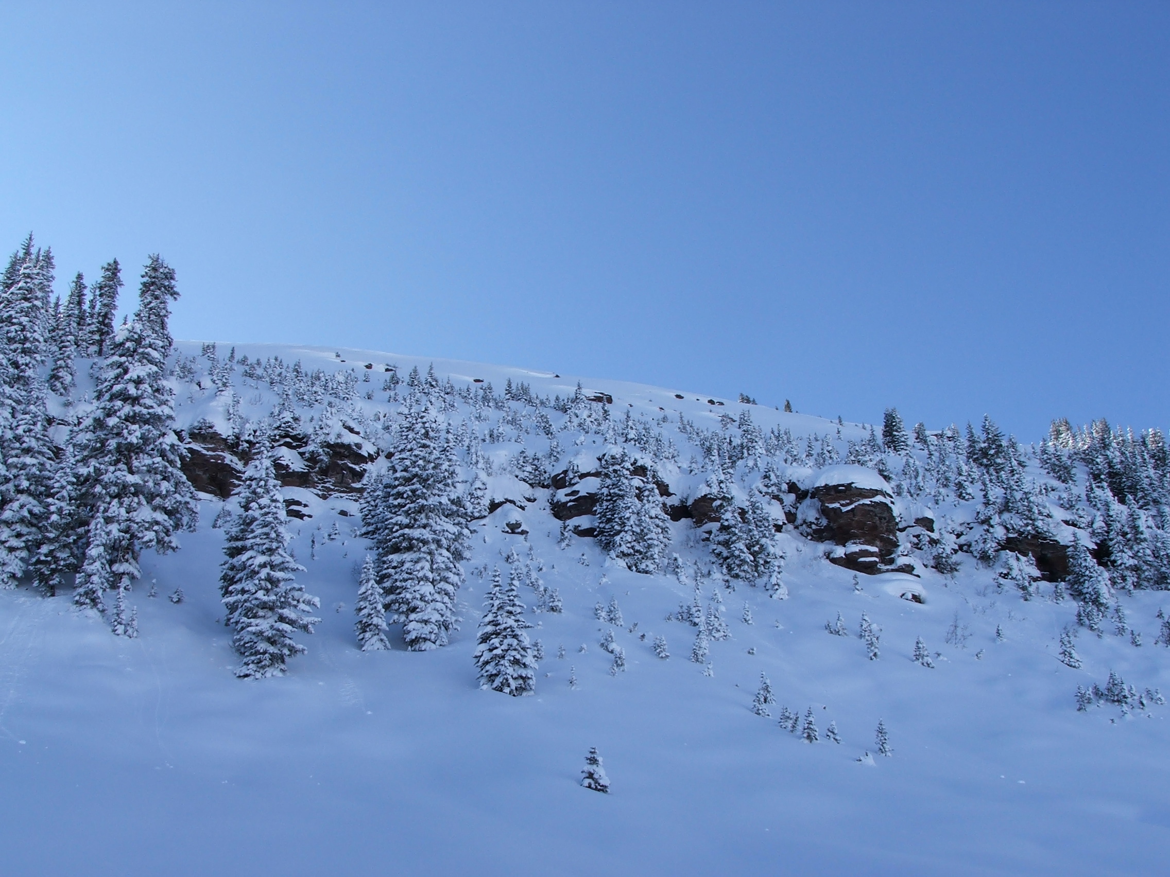 First time cutting over to the MVP area from Old Man’s, wanting to see how the Forgotten Trees were skiing. Upper turns in the trees were more stale cake but fresh, as most of the other tracks headed straight. Came upon the first cliff band and side-stepped off a three-foot ledge onto a briefly steep(40 degree) open tree pocket after the rocks. Sunk to the ground and fractured a small area under the rocks that disintegrated like sand.