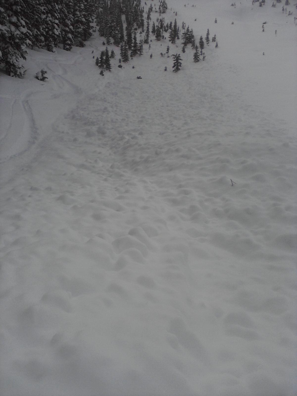 Bottom line: still crappy stability, but most main areas have run, although lurking pockets of instability im sure are there especially in the trees. Able to ski covered bed surface in all steep areas to avoid possible triggers. Although not like a few days ago, still very suspect in unskied debris free N-NE areas all elevations but especially down lower. East facing had crusted up due to the sunhit.