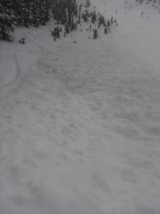 Checked out the track in the skier’s right side of the Wall that was put down by the skier who triggered the slide. He skied the first gully skier’s right in the Wall where you can sneak through through cliff band with minimal/ no air. A small sluff on the line, but that seemed to not relate to the actual avalanche. The actual slide was remotely triggered 75 feet to the skier’s left of the track towards the middle of the bowl. The crown was a foot to two feet deep.