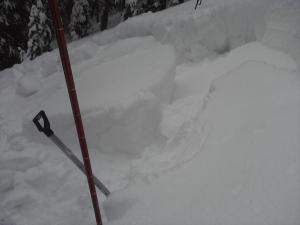Cut my block, took my skis than took one boot step uphill next to the block and the convex roll fractured 4 feet above the last crown 75 feet wide and moved about a foot. Exactly why you keep your Float pack on during a test. It did surprise me and I ended up hugging a chair sized block but again the slide had happened here couple days ago and I was standing on bed surface. I can only imagine what is was like on Sunday in these trees. The block itself triggered remotely with a Q1(easy clean) shear as well.