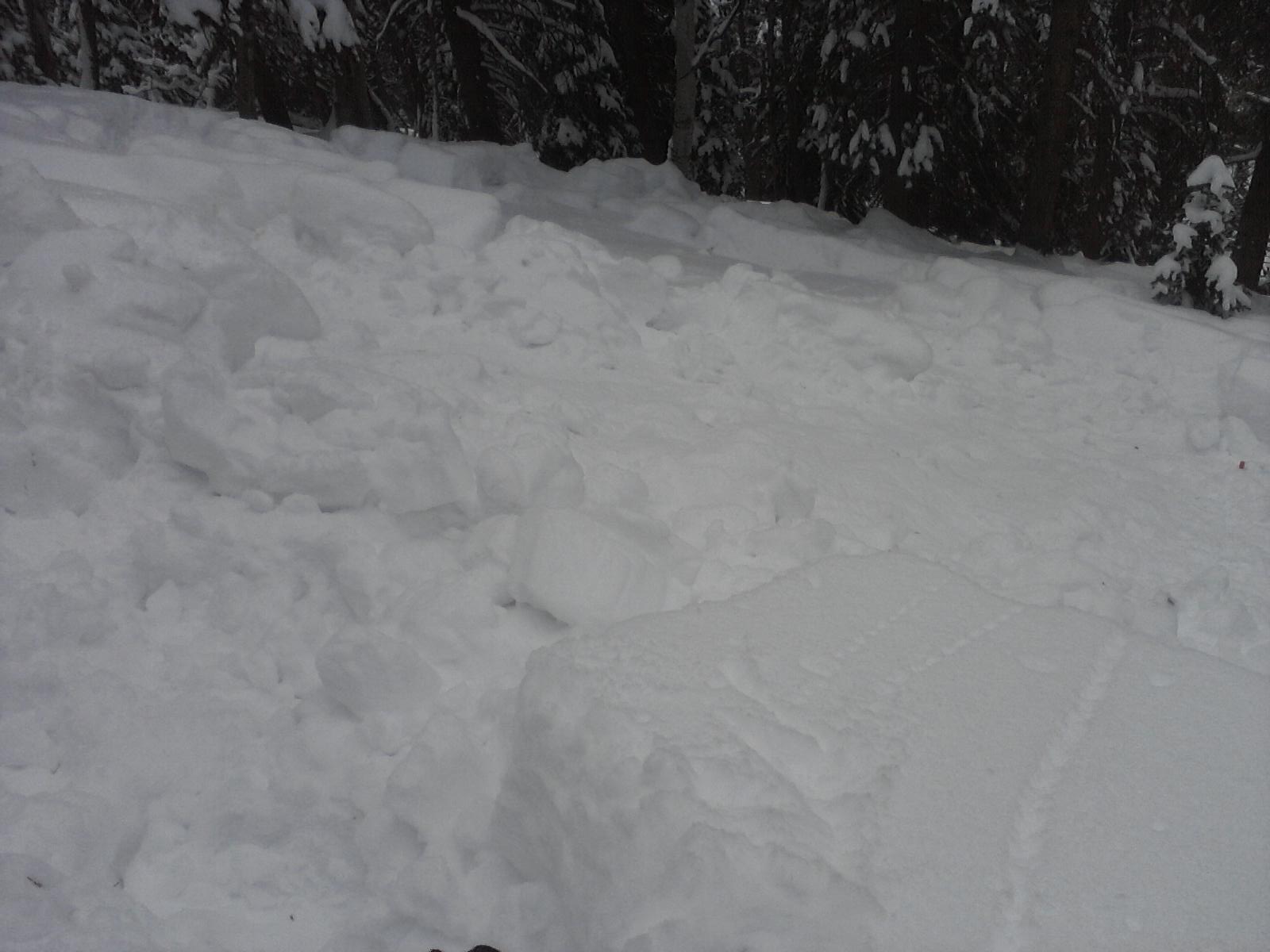 It must have come to me in a dream, that everywhere in EV was filled with evidence of the large cycle that happened this Sunday. Crowns and debris were everywhere in areas over thirty degrees, N-NE facing in the trees. Found a good spot on a NE convex roll over around 9500 feet in a 150 foot wide clearing that had fractured during the cycle. A good spot to test in as the hangfire was minimal above, about fifteen feet to the line of trees and bed surface under my feet.