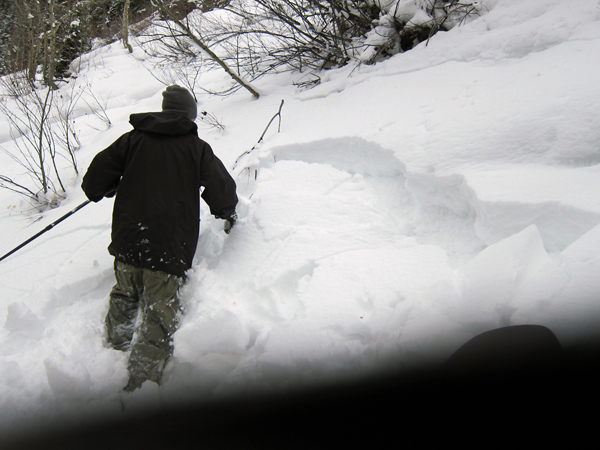 As we entered the middle section, things changed dramatically. We leapfrogged down to the traverse out, staying next to the ridgeline. Paulie let me know he was triggering whoomphing and propagating cracks in areas that I had skied. The thirty pound differential between us was enough to make the difference and allow him to punch through the saturated crust and trigger failure. We regrouped and went farther into the old stands. Entering lower elevations and into the rain/snow mix layer from the night before, the dense new snow wasn’t adhering to the increasingly saturated melt freeze crust. Bottom line the lower we got, the higher the avalanche danger became. We were able to traverse out in cracking boot top on ground dense snow to the aspens. If we get the snow predicted on Saturday and the pack on the Benchie traverse out becomes deep enough to slide, the traverse out could be treatcherous.The aspens down low were extremely sensitive, and shooting cracks and small slab collapses were all over, even worse than the cracking on Wednesday. Again Paulie, being a beast, was triggering areas I didn’t all the way to the bus.