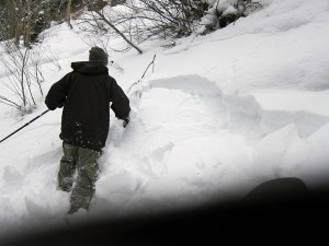 I harnessed up and tied in with the glacier line around a stout tree. Please be clear, it is not my intention to rope off and start popping off slides on purpose. A safety line is in every guide’s pack and is an extremely important tool for any back country traveler. Not to mention, it is the 8th Commandment in Bruce Tremper’s “Staying Alive in Avalanche Terrain”: “Thou shalt use a Belay rope! Most serious avalanche professionals carry and use a belay rope.”
