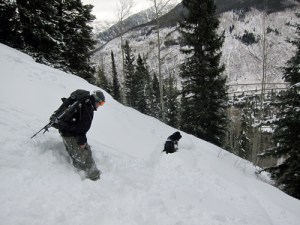 Since we decided against east vail yesterday from the top we decided to hike a run we do fairly often with the dogs. I think people refer to it as half chute. regardless we were gonna hike up through the woods as we have an established boot pack and you’re never in any high risk areas. It was a rugged hike and it seemed wicked warm today. the snow was super sticky and heavy. Once we got to the top the snow had gotten lighter so we decided to dig around and check the snow out. We had already broken the top zone into mellow sluff slides in the trees on two prior occasions so we were wondering if it was much different than the area we dug yesterday.