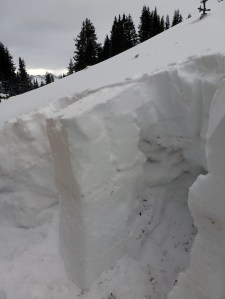 Second round I met up with Tom and Stew from Snowell at the Poma shack and with the first run info we all decided to roll back to Tele Line. Had gotten a text on the Visti from J that his group (just after us in the morning) had skied left side Benchmark(Abrahams’) and had ripped out a quarter of the bowl while poking around on the edge. It broke below them and no one was caught. Eager to see the aftermath, I hustled ahead to the TOTW and rolled over the edge to see a 100 ft wide eighteen inch to two foot crown starting from the ridge over the Mushroom Rock area, stepping down. It rolled past the flats and through the second cliff band, to the next flats. Again the interface betweenpencil/ knife hard scoured scarp covered with the recent windslab was the culprit, triggered by the weight of a skier at the cliffs. HS-AS-R2-D2-I (look it up on Google).